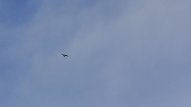 I have no idea how long it had been there before the Raven's call, but we watched it soar back and forth for over quarter of an hour. Time enough to go and retrieve binoculars for a better view. Indeed, time enough to saunter back indoors again and fetch a 'proper' camera, as my small compact one wouldn't cope with either the distance involved or the rapid movement of the subject.