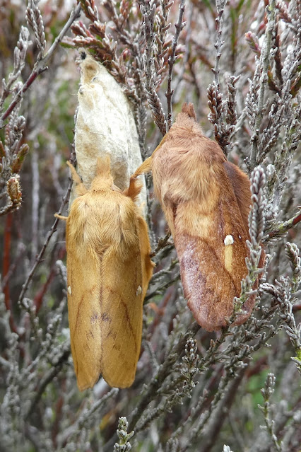 Returning to the car, I detoured a few metres into the undergrowth to check out a tiny pool, but still without any luck. However, as I dejectedly turned around to retrace my steps, there on a clump of Heather was a very unexpected sight, a pair of large brown moths and a cocoon. Now, in these parts, large brown moths tend to be Northern Eggars, a relative of the Oak Eggar further south, and these ones seemed to fit the bill.